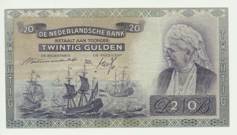 هو - هي twintig gulden biljet met de afbeelding Koningin-Regentes Emma heeft op de voorzijde ook een aantal slagschepen in het water afgebeeld. Op de achterkant staan de Schreiers toren en de Sint Nicolaaskerk afgebeeld. De handtekeningen op het biljet zijn van DNB-Secretaris Westerman-Holstijn en DNB-President Leonardus Trip. Van het twintigje met Emma zijn twee varianten beschikbaar namelijk: