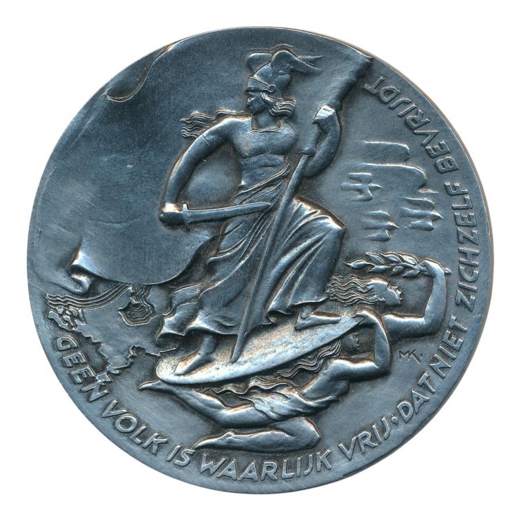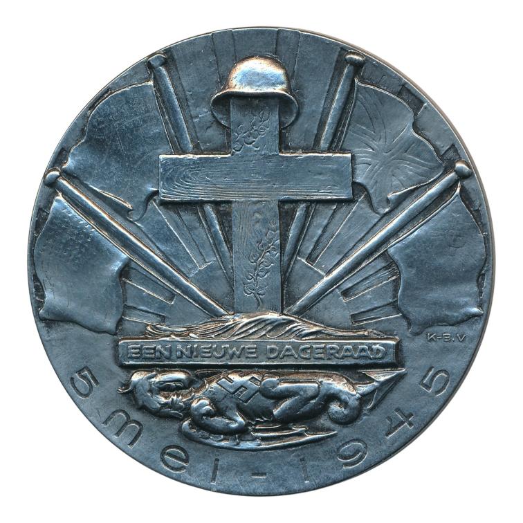 Penning ter gelegenheid van de bevrijding. ‘Voorzijde: ‘Geen volk is waarlijk vrij dat niet zichzelf bevrijdt.’ Het kruis met daaronder een geplette adelaar met hakenkruis, vlaggen van Amerika, Frankrijk, Engeland en Rusland achter het kruis. Keerzijde: ‘Een nieuwe dageraad – 5 mei 1945’.