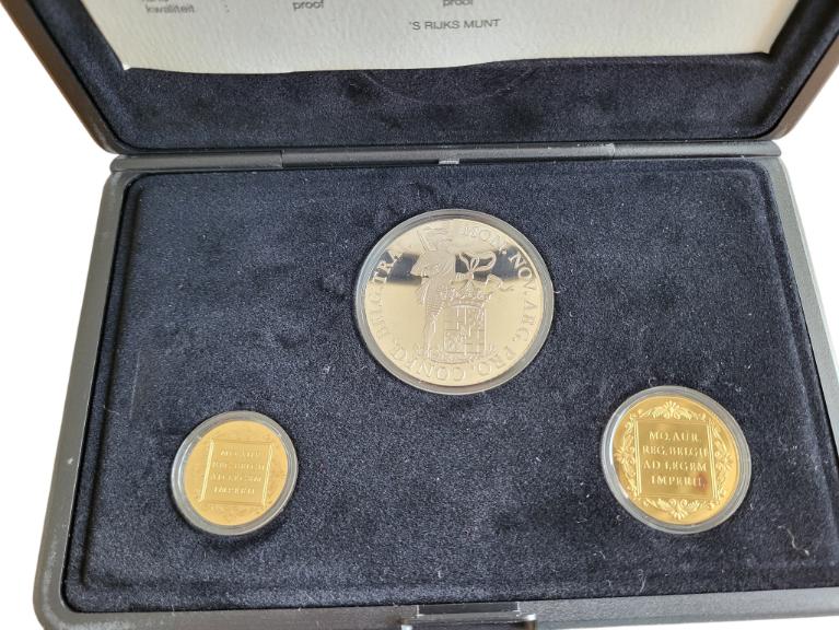 Bevat ook de enkele gouden dukaat is naar het ontwerp van de gouden dukaat van 1586, hij weegt 3,494 gram en heeft een goudgehalte van 983/1000 goud.