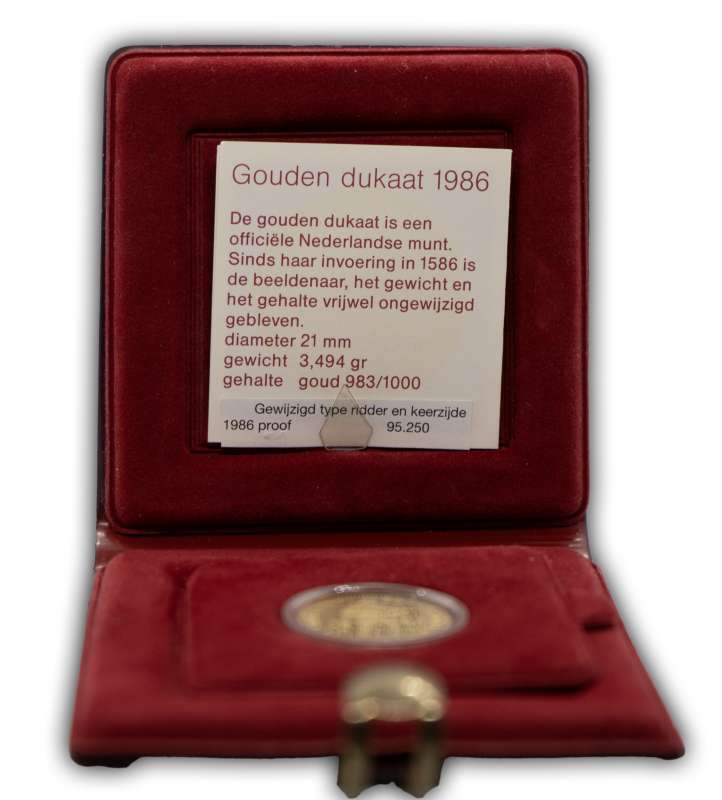 دوقية هولندية ذهبية 1986 في كاسيت Kwaliteit: Proof الوزن: 3,494 جرام محتوى الذهب: 983/1000 صافي الذهب: 3.434602 جرام