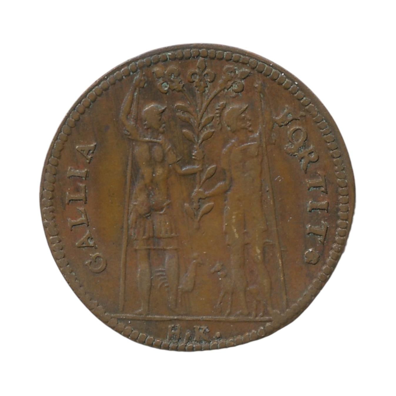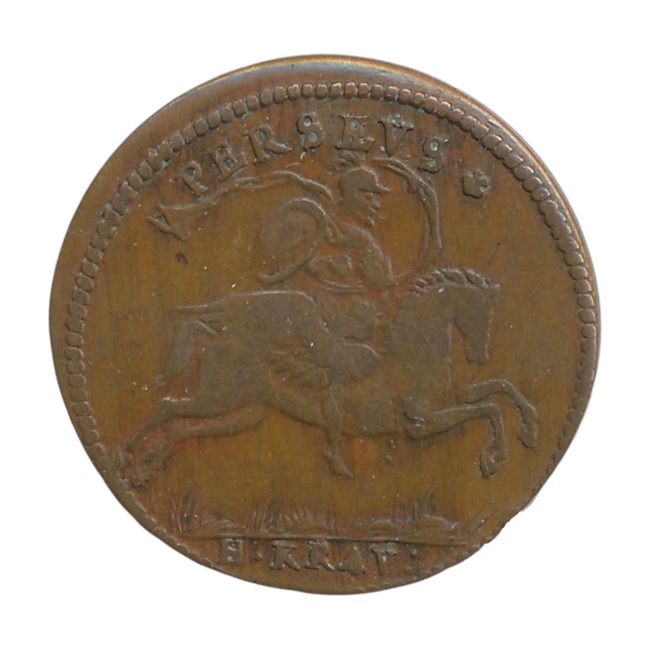 Penning gegraveerd door Hans Krauwinckel II. Voorzijde: ‘Gallia fortit’, Hercules en Mars. Keerzijde: Perseus te paard met helm en schild.
