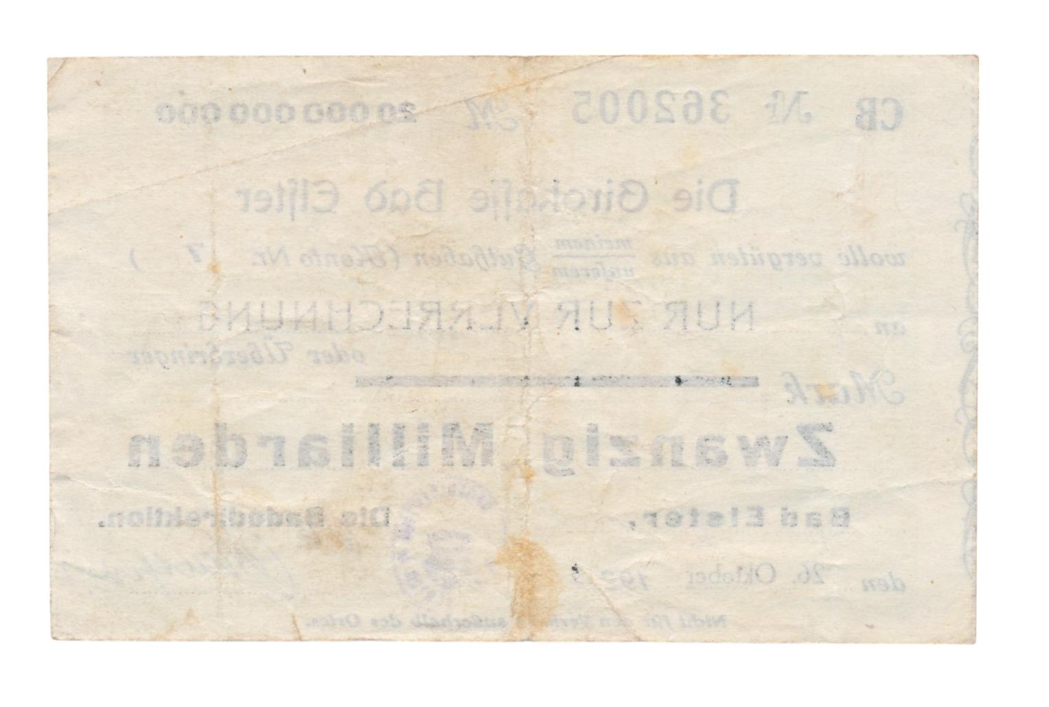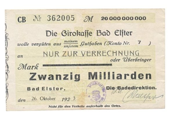 Duitsland 20 miljard Mark 1923 bon Girobank Bad Elster Siehe Scans für weitere Einzelheiten. Bei Fragen können Sie uns gerne eine Nachricht schicken.