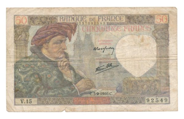 Frankreich 50 Francs 1940-1942 Jacques Coeur Auswahl: 93. Auf der Vorderseite Jacques Coeur und Palast von Bourges.