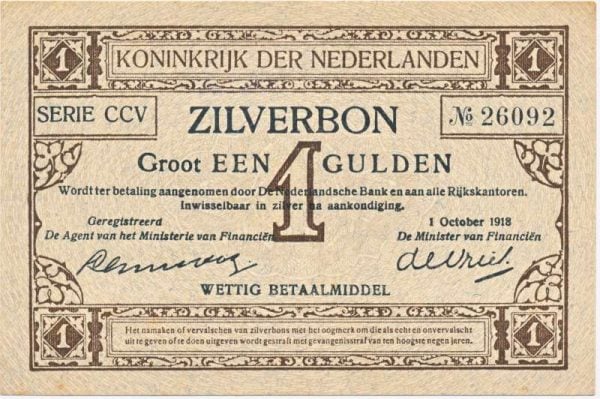 Nach dem Ausbruch des Ersten Weltkriegs brachten viele Niederländer ihre Banknoten und Geldscheine zur Nederlandsche Bank, um sie gegen Gold- und Silbermünzen einzutauschen. Dies führte zu einer Münzknappheit, und die Nederlandsche Bank musste gemeinsam mit der Regierung nach einer Lösung suchen. Schließlich wurde beschlossen, Silberscheine auszugeben, um den Mangel an Wechselgeld auszugleichen. Diese konnten nach Ankündigung in Silbermünzen umgetauscht werden. Der silberne Kupon von 1914 war nicht ausreichend fälschungssicher, so dass 1916 eine neue Art von Silbernote herausgegeben wurde. Diese Banknote enthielt ein besseres Wasserzeichen und war aus besserem abriebfestem Papier hergestellt. Die Silbernote von 1916 wurde bis 1918 ausgegeben und war mit den folgenden Unterschriftenkombinationen erhältlich: