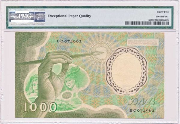 Diese Note wurde von der Inspektionsgesellschaft PMG Notes inspiziert. Die Qualität von PMG 35 EPQ entspricht der Sammlerqualität very fine. Die Note hat keine Risse, und ist noch in einem sauberen Zustand. Auch das Papier der Banknote ist noch in gutem Zustand. Da der Schein weltweit gesammelt wird, ist er heute immer schwerer zu finden. Der Tausendguldenschein mit Rembrand wurde schließlich 1978 von der niederländischen Bank aus dem Verkehr gezogen, so dass der Schein 22 Jahre lang im Umlauf war. Da tausend Gulden in den späten 1970er Jahren auch ein großer Betrag waren, wurden viele der tausend Gulden mit Rembrandt wieder umgetauscht, so dass sie heute eine seltene Banknote ist.