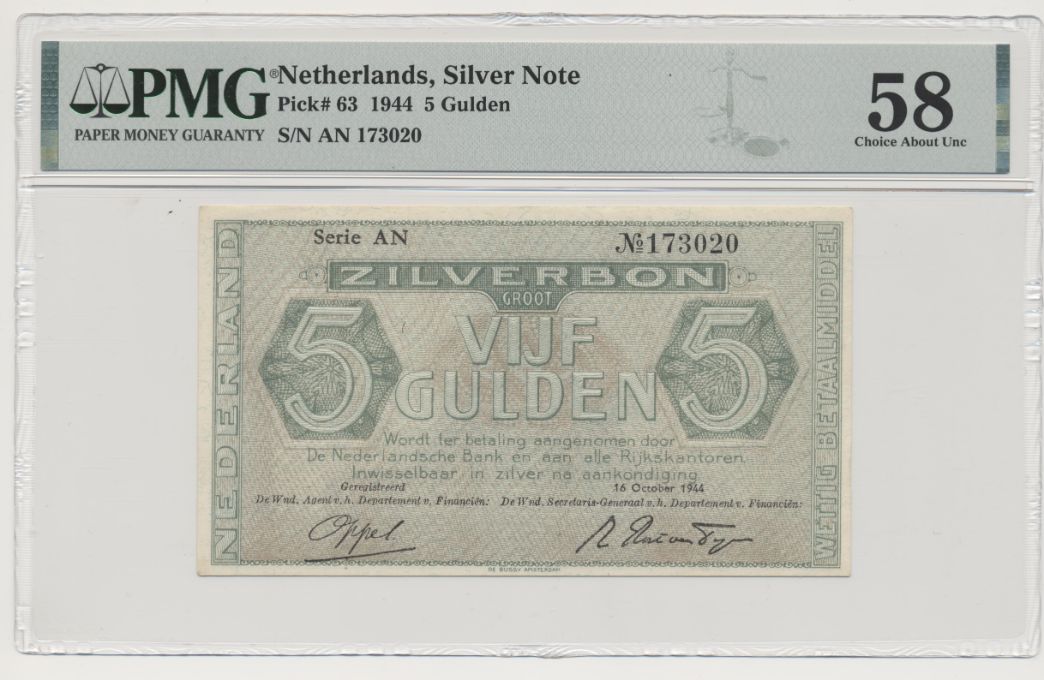 Während des Zweiten Weltkriegs wurde erneut eine Fünf-Gold-Silbernote ausgegeben. Dieser war nicht dazu gedacht, irgendwann in Silber umgetauscht zu werden, sondern sollte den Mangel an Wechselgeld ausgleichen. Denn der Wert des Guldens war durch die Besatzung so stark gesunken, dass alle kleineren Scheine schnell abgenutzt waren und es oft kein Wechselgeld für die häufig im Umlauf befindlichen Fünfzig- oder Hundertguldenscheine gab. Der 5-Gulden-Silberschein von 1944 ist der einzige Silberschein in der niederländischen Geschichte, der von Meinoud Rost-van Tonningen unterzeichnet wurde, der sowohl Präsident der Nederlandsche Bank als auch amtierender Generalsekretär des Finanzministeriums war. Die andere Unterschrift auf der Silbernote stammt von Oppel, Beamter des Finanzministeriums. Neben der Fünf-Gulden-Silbernote 1944 sind noch zwei weitere Silberscheine zu dieser Serie erhältlich: