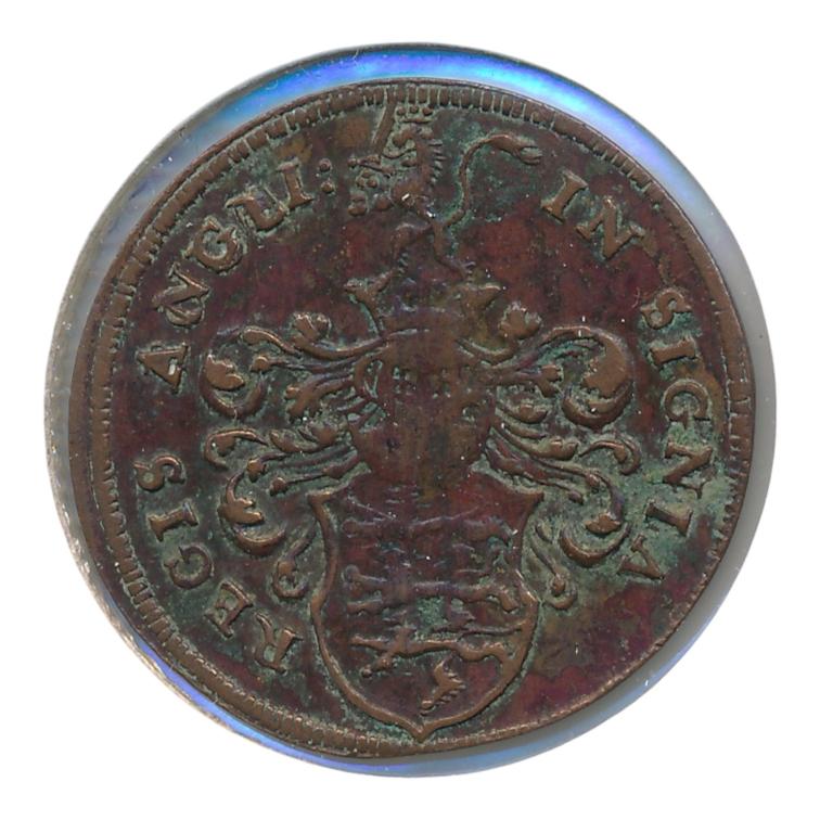 Voorzijde: afbeelding koningin Elizabeth I op een troon, met zwaard en scepter. Achterzijde inscriptie: Regis Angli In Signia’.