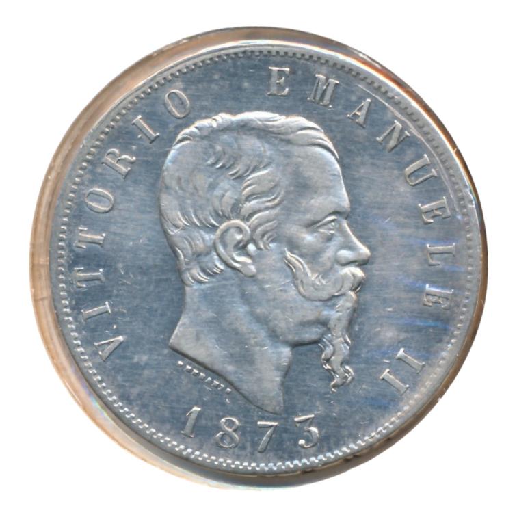Italië 5 Lire 1873 (Zeer fraai) Groot formaat: diameter 37 mm, gewicht 25 gram. Zilvergehalte: 900/1000. See scans for more details. For questions, feel free to send us a message.
