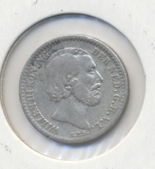 The dime of William 3, minted from 1849 through 1890, is part of the Dutch coinage history of the nineteenth century. This coin is made of 640/1000 silver, has a diameter of 15 millimeters and weighs 1.4 grams. On the obverse is an image of King William 3. The reverse side shows the value indication "10 cents" and the year. In addition to the 10 cents, the series also includes the following coins: