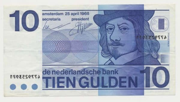 In 1968 a new tenner with the effigy of Frans Hals came into circulation, the old tenner with Hugo de Groot was due for replacement and the Dutch Bank wanted a new revolutionary design. The tenner with Frans Hals has a bright blue color and guilloche patterns on the front and back. The Frans Hals tenner was removed from circulation in 2002 with the introduction of the euro. The Frans Hals tenner was part of the Erflater series, designed by Oxenaar. In addition to the ten note, four other bills are part of the Erflater series: