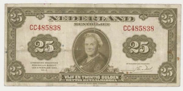 During World War II, the Allies were already preparing in 1943 for the invasion that would take place in 1944. The twenty-five guilder coin bill with Queen Wilhelmina on it is therefore part of a special piece of Dutch history. When liberating areas, soldiers also had to be given money to spend in liberated areas, because it was difficult to spend foreign money in areas where the rate of that money was not known and many inhabitants did not know the money and probably would not accept it. Therefore, it was decided by the Ministry of Finance to print Dutch guilders in the United States, and these coin bills therefore had the image of Queen Wilhelmina on the front. The twenty-five guilder coin bill was signed by Johannes van den Broek (Minister of Finance). In addition to the twenty-five guilder coin bill, the following bills accompanied the series printed in the united states: