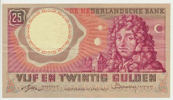 The twenty-five guilders featuring Christiaan Huygens is part of the series of banknotes designed by Eppo Doeve in the 1950s as the first official legacy series. The obverse shows astronomer Christiaan Huygens and the background shows an image of his country house (Hofwijck) in Voorburg. Some guilloche patterns can be seen on the eighth side, and the signatures on the bill are of DNB President Holtrop and DNB Secretary de Jong. In addition to the twenty-five guilder Huygens bill, the following bills are also among the series of legacy notes from the 1950s: