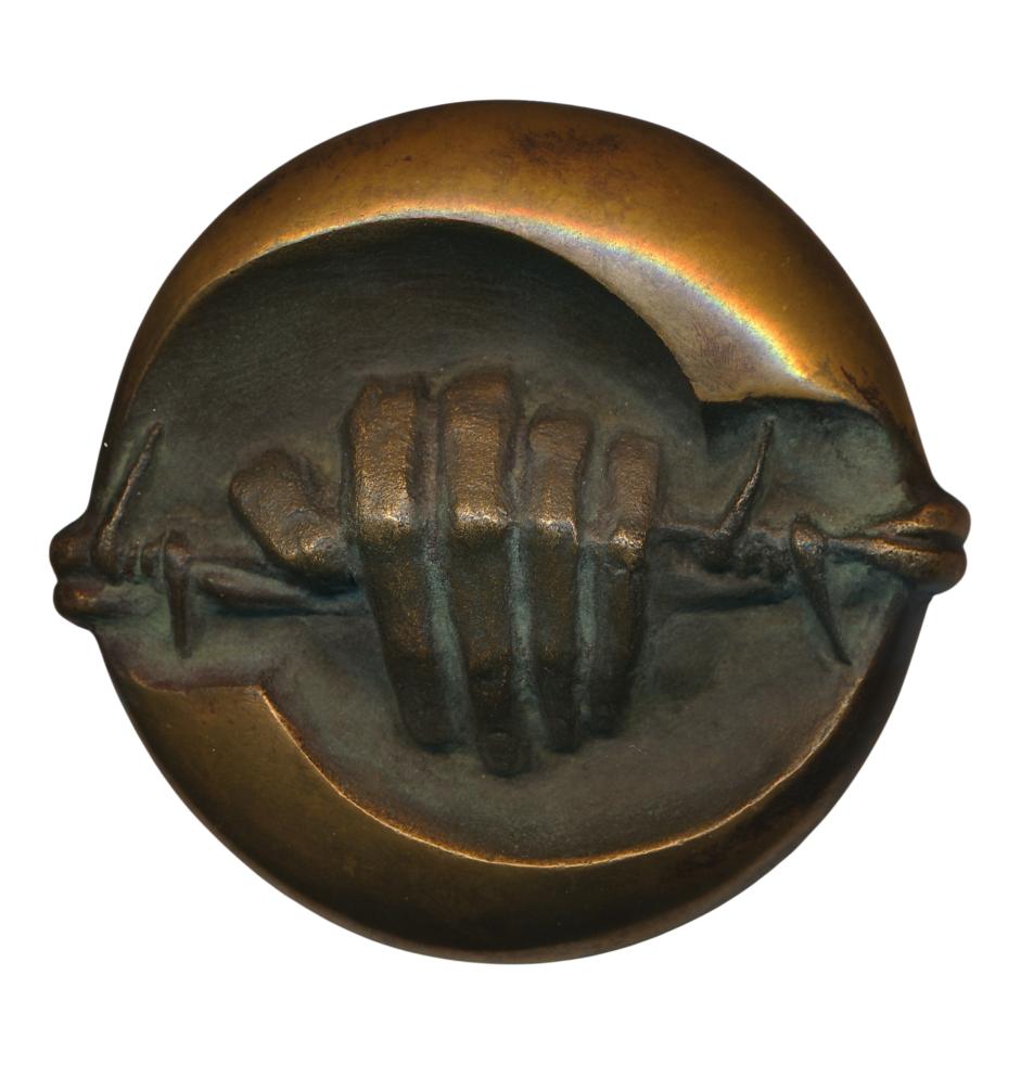 Mogelijk uitgegeven door de Vereniging voor Penningkunst. ‘Voorzijde: hand om prikkeldraad. Keerzijde: draadspanner. Symboliek: opoffering, pijn niet uit de weg gaan? Maker: R. A. 1975