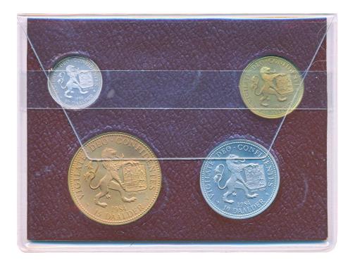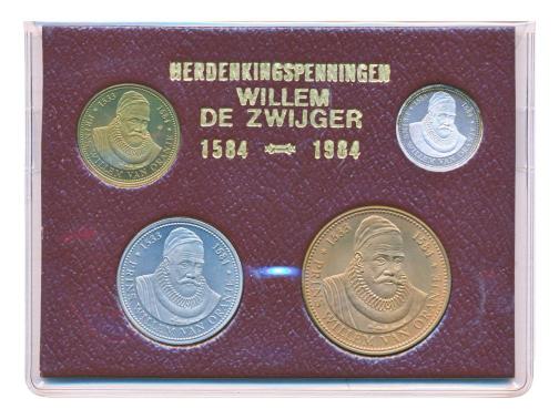 The set contains 4 medals with Prince William of Orange on the obverse and the dates 1533 and 1584. The reverse shows a lion holding the coat of arms, the text "Vigilate deo confidentes" and the value of the medal: 7 1/2, 10, 15 or 50 daalder.