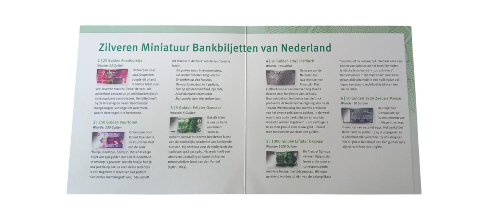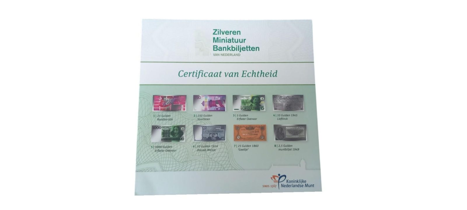 Zilveren plaatjes met miniatuur bankbiljetten in full colour foliedruk, verpakt in luxe box. Inclusief Certificaat van Echtheid. Uitgegeven door de KNM.