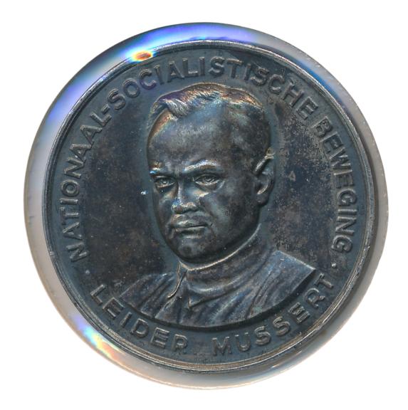 Voorzijde: portret ‘NSB-leider Mussert’. Keerzijde: ‘Kerstmarsch 1942 – W.A. Marcheert – Hou-zee’