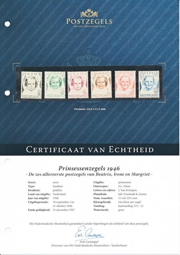 Postzegels van het Koninklijk Huis: De zes allereeerste postzegels van Beatrix, Irene en Margriet. Inclusief Certificaat van Echtheid.