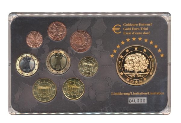 Goldeuro-Entwurf – Gold Euro Trial – Essai d’euro doré. De set bestaat uit euromunten van diverse jaren en diverse letters en een goud geplateerde koperen penning. Verpakt in een hard plastic behuizing. NB: De behuizing kan krasjes bevatten.