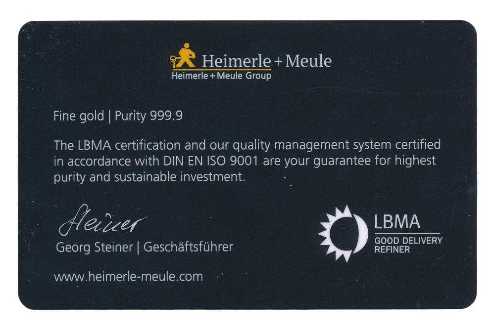 Barre d'or de 1 gramme Carte Heimerle et Meule (Discover gold) Fourni sous forme de carte de crédit.