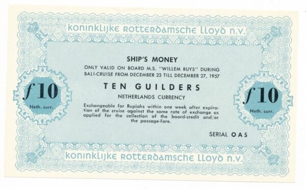 Scheepsgeld was geïntroduceerd omdat het destijds verboden was om Nederlands geld uit te voeren. Dit biljet was geldig aan boord van het schip “De Willem Ruys”. Deze waardebonnen konden tijdens de reis worden uitgegeven aan boord van het schip waarvoor ze gedrukt waren, of worden omgewisseld binnen een bepaalde termijn na aankomst op de eindbestemming. De tegoedbonnen zijn in 2 kleuren gedrukt en zijn enkelzijdig. Dit biljet is in UNC staat.
