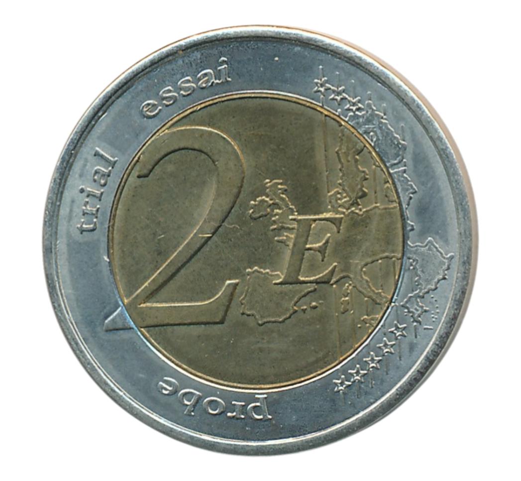 Een probe 2 euro (niet daadwerkelijk uit te geven) met op de muntzijde “Probe, trial, essai”.