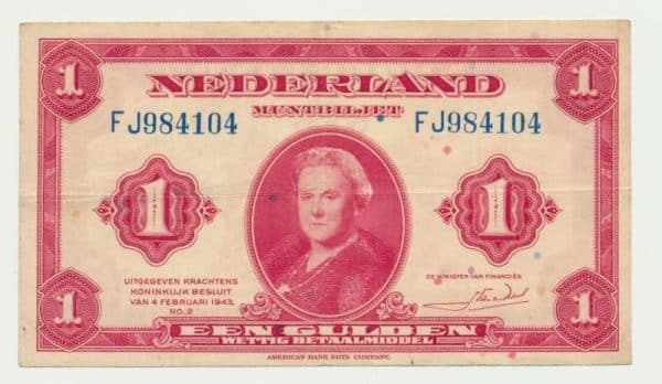 Pendant la Seconde Guerre mondiale, les Alliés se préparent dès 1943 à l'invasion qui aura lieu en 1944. Le billet d'un florin avec Reine Wilhelmina Il fait donc partie d'un pan particulier de l'histoire néerlandaise. Lors de la libération des régions, les soldats devaient également recevoir de l'argent à dépenser dans les zones libérées, car il était difficile d'émettre de la monnaie étrangère dans des régions où le taux de change de cette monnaie n'était pas connu et où de nombreux habitants ne connaissaient pas la monnaie et ne l'accepteraient probablement pas. Le ministère des Finances a donc décidé d'imprimer des florins néerlandais aux États-Unis, et ces billets de monnaie portaient donc l'image de la reine Wilhelmine au recto. Le billet d'un florin a été émis en 1943 et porte la signature de Johannes van den Broek (ministre des Finances) au recto. La série de florins imprimés en Amérique comprenait également le :