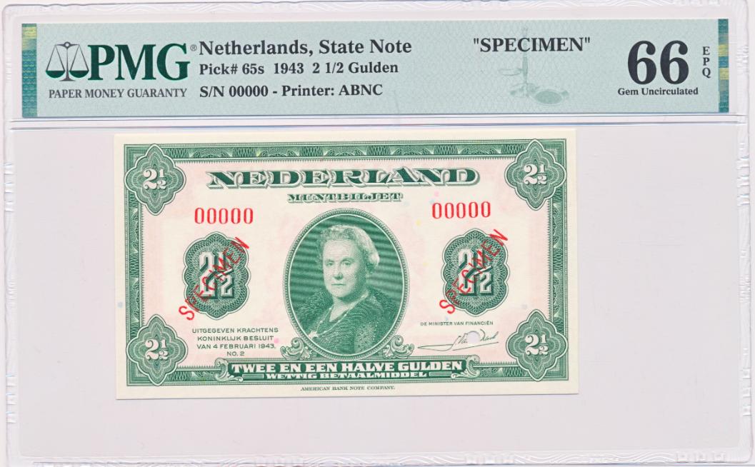 Pays-Bas 2,5 florins 1943 Wilhelmina Spécimen PMG66 EPQ