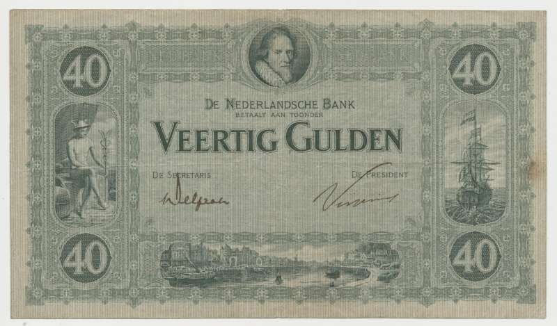 La note de 40 gulden met prins Maurits is een bijzonder bankbiljet. De waarde van 40 gulden was dan ook niet gebruikelijk, maar er werden uiteindelijk door de Nederlandsche Bank drie biljetten van 40 gulden uitgegeven. De eerste in 1814, de tweede in 1861 en het laatste model werd in 1923 tot en met 1927 in omloop gebracht. Het 40 gulden biljet ‘Maurits’ heeft de handtekenen van DNB-President Vissering en DNB-Secretaris Delprat. Op de voorzijde is een galjoen te zien, Mercurius met staf en een rivier met een dorp. Op de achterzijde is een afbeelding van het oude gebouw van de Nederlandsche Bank aan de Turfmarkt in Amsterdam te zien. Het biljet is uiteindelijk in 1945 bij de geldzuivering uit omloop gehaald. Het biljet is niet veel in omloop geweest, omdat de waarde van 40 gulden niet erg gebruikelijk was in circulatie. Het is daarom vandaag de dag ook lastig om aan te komen.