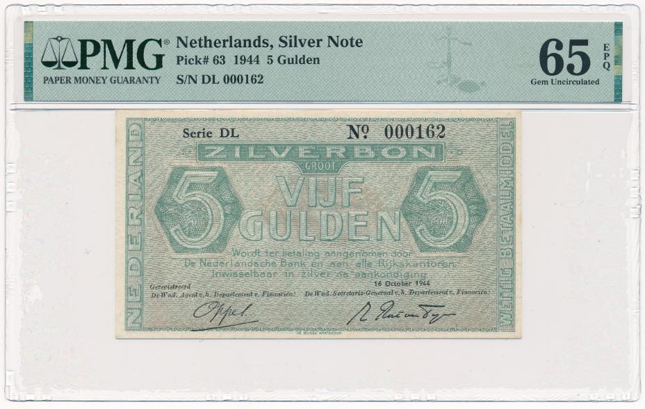 Pendant la Seconde Guerre mondiale, un billet de cinq or en argent a de nouveau été émis. Ce billet n'était pas destiné à être échangé contre de l'argent, mais à pallier le manque de monnaie. En effet, la valeur du florin avait tellement baissé à cause de l'occupation que tous les petits billets s'usaient rapidement et qu'il n'y avait souvent pas de monnaie pour les billets de cinquante ou de cent florins qui circulaient fréquemment. Le billet de cinq florins en argent de 1944 est le seul billet en argent de l'histoire des Pays-Bas signé par Meinoud Rost - van Tonningen, qui était à la fois président de la Nederlandsche Bank et secrétaire général par intérim du ministère des Finances. L'autre signature figurant sur le billet d'argent est celle d'Oppel, fonctionnaire du ministère des Finances. Outre le billet de cinq florins en argent de 1944, deux autres billets en argent sont disponibles dans la série :