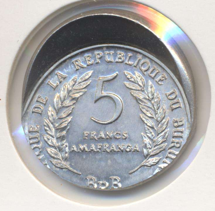 Burundi 5 francs 1971 misslag Grote misslag aan de bovenzijde. Gedeeltelijk blanco geslagen.