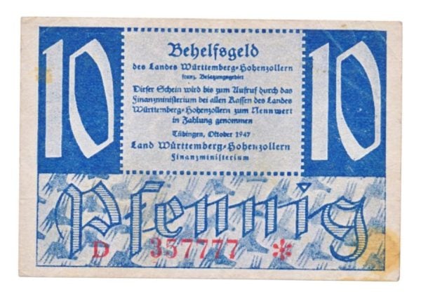 Duitsland 10 Pfennig 1947 Behelfsgeld Württemberg-Hohenzollern Zie scans voor meer details. Voor vragen, stuur ons gerust een bericht.