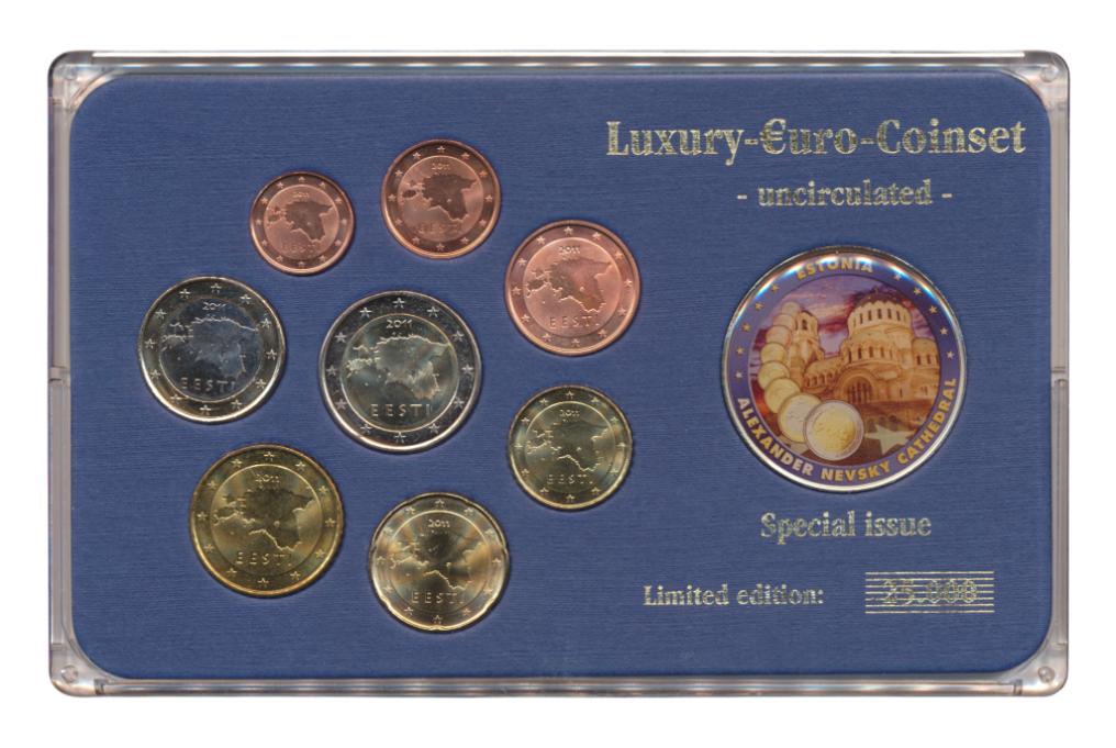 Estland muntenset met de standaard euromunten van Estland (vanaf 2011) in UNC-kwaliteit, inclusief penning met op voorzijde gekleurde afbeelding van de Alexander Nevsky Cathedral. Beperkte oplage: 25.000 stuks.