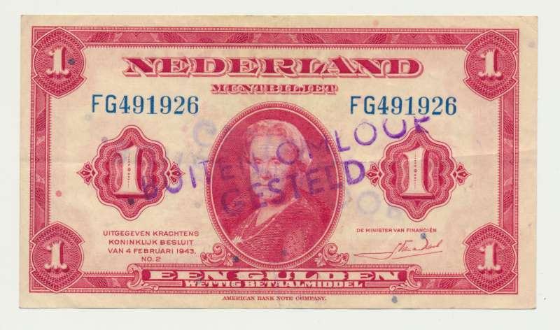 Tijdens de tweede wereldoorlog bereidden de geallieerden zich in 1943 al voor op de invasie die in 1944 plaats zouden vinden. Het muntbiljet van een gulden met koningin Wilhelmina erop is dan ook onderdeel van een bijzonder stukje Nederlandse geschiedenis. Bij het bevrijden van gebieden moesten de soldaten ook geld meekrijgen om uit te kunnen geven in bevrijd gebied, omdat het lastig was buitenlands geld uit te geven in gebieden waar de koers van dat geld niet bekend was en veel inwoners het geld niet kende en waarschijnlijk ook niet aan zouden nemen. Daarom werd er door het ministerie van financiën besloten om in de Verenigde Staten Nederlandse guldens te drukken, en deze muntbiljetten hadden op de voorzijde dan ook de afbeelding van koningin Wilhelmina. Het muntbiljet van een gulden is in 1943 uitgegeven en heeft de handtekening van Johannes van den Broek (minister van financiën) op de voorzijde. Bij de serie in Amerika gedrukte guldens horen ook nog de: