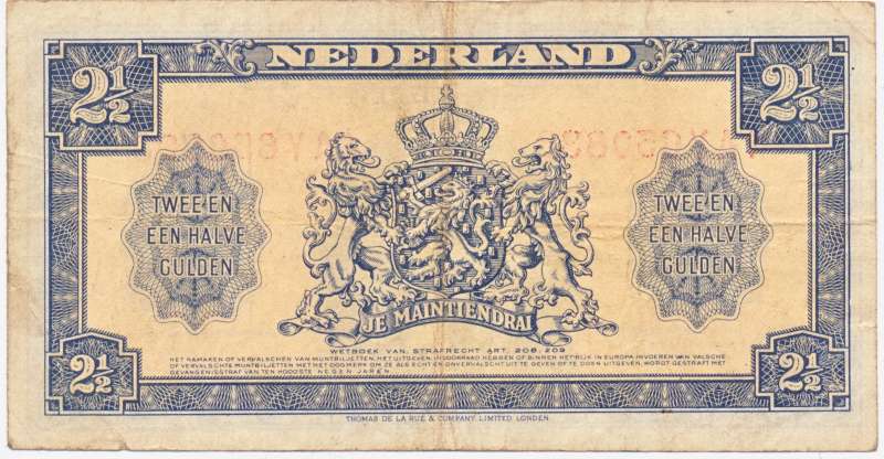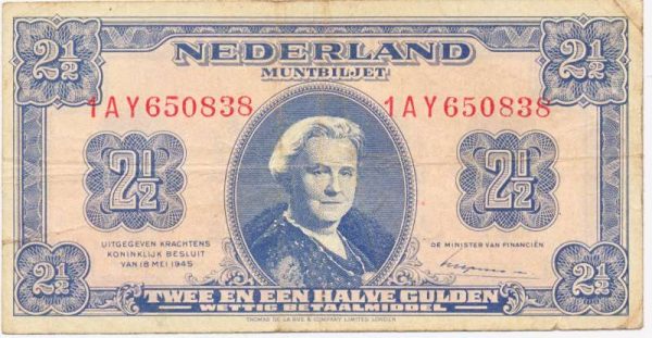 Omdat er al plannen gemaakt waren om de economie na de bevrijding te herstellen doormiddel van een geldzuivering, moest er ook nieuw geld gemaakt worden om het oude geld mee om te wisselen. Daarom werden er in Londen (bij Thomas de la Rue) biljetten van een en van twee en een halve gulden gedrukt om bij de bevrijding genoeg nieuw geld te hebben. Het muntbiljet van twee en een halve gulden 1945 heeft de handtekening van de minister van financiën, Gerardus Wilhelmus Maria Huysmans, op de voorzijde. Later in 1945 zijn er ook nog biljetten van tien en honderd gulden gedrukt, en de serie bestaat in totaal uit de volgende biljetten: