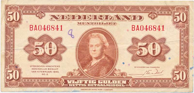 Tijdens de tweede wereldoorlog bereidden de geallieerden zich in 1943 al voor op de invasie die in 1944 plaats zouden vinden. Het muntbiljet van vijftig gulden met koningin Wilhelmina erop is dan ook onderdeel van een bijzonder stukje Nederlandse geschiedenis. Bij het bevrijden van gebieden moesten de soldaten ook geld meekrijgen om uit te kunnen geven in bevrijd gebied, omdat het lastig was buitenlands geld uit te geven in gebieden waar de koers van dat geld niet bekend was en veel inwoners het geld niet kende en waarschijnlijk ook niet aan zouden nemen. Daarom werd er door het ministerie van financiën besloten om in de Verenigde Staten Nederlandse guldens te drukken, en deze muntbiljetten hadden op de voorzijde dan ook de afbeelding van koningin Wilhelmina. Het muntbiljet van vijftig gulden is ondertekend door Johannes van den Broek (minister van financiën). Naast het vijftig gulden muntbiljet zijn er ook nog de volgende biljetten bij de in de verenigde staten gedrukte serie: