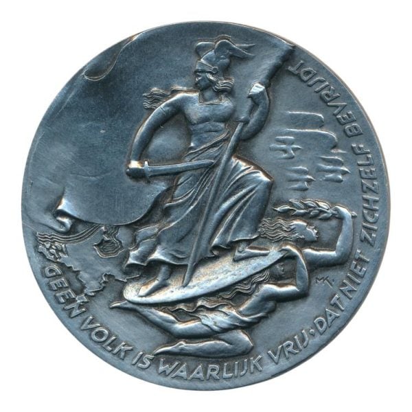 Penning ter gelegenheid van de bevrijding. ‘Voorzijde: ‘Geen volk is waarlijk vrij dat niet zichzelf bevrijdt.’ Het kruis met daaronder een geplette adelaar met hakenkruis, vlaggen van Amerika, Frankrijk, Engeland en Rusland achter het kruis. Keerzijde: ‘Een nieuwe dageraad – 5 mei 1945’.