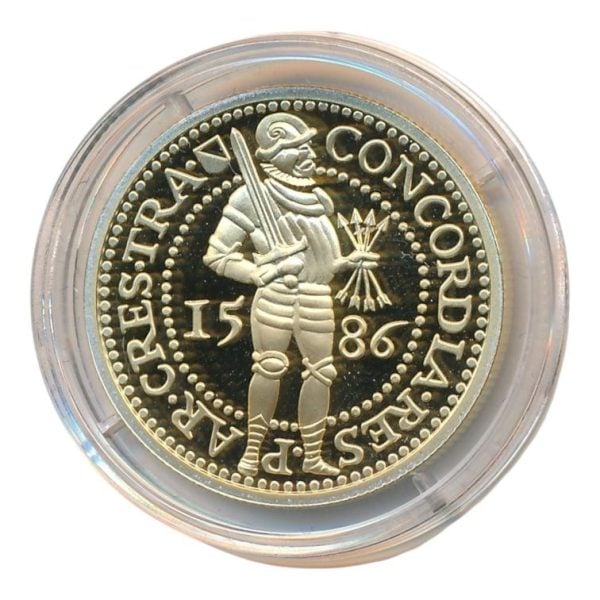 Nederland Naslag Dukaat 1586 Deze naslag is 24 karaat verguld op zilver. Gehalte zilver: 925/1000 Gewicht: 10 gram