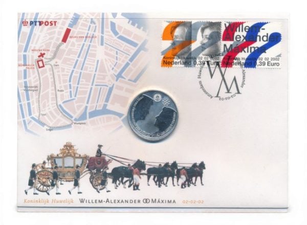 Uitgegeven door de PTT Post ter gelegenheid van het koninklijk huwelijk van Willem-Alexander en Máxima op 2 februari 2002. De envelop bevat de speciale zilveren penning en de speciale postzegel voor het koninklijk huwelijk, vertoont een stukje plattegrond van Amsterdam met de locaties van het huwelijk (Beurs van Berlage en Nieuwe Kerk en Koninklijk Paleis).