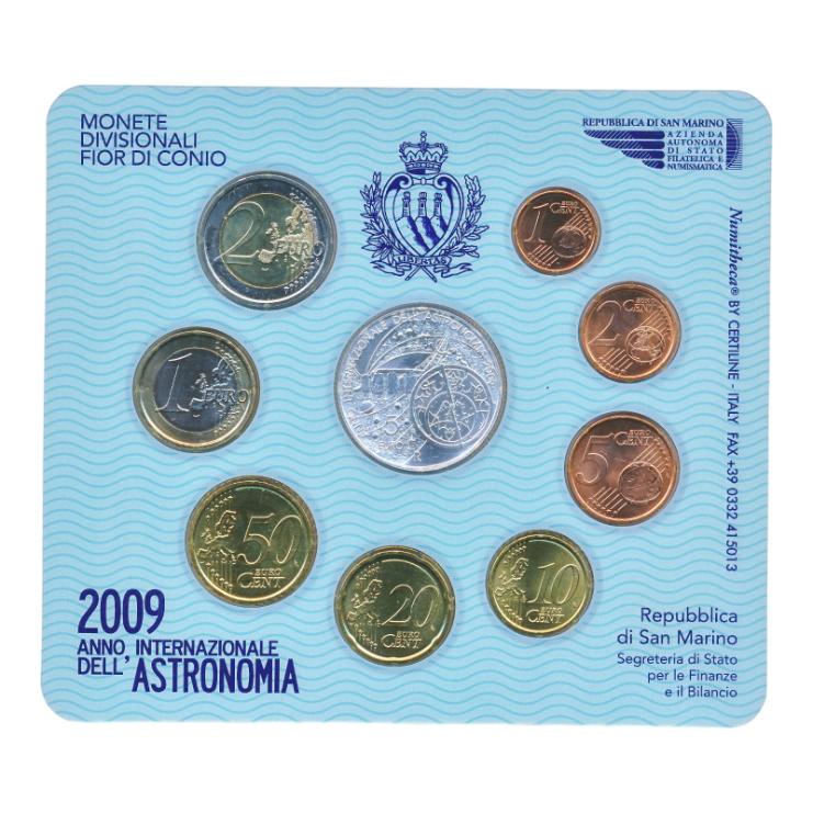 San Marino Jaarset euro 2009 BU – inclusief 5 euro zilver Astronomie De set bevat de 1 eurocent t/m 2 euro in BU-kwaliteit.