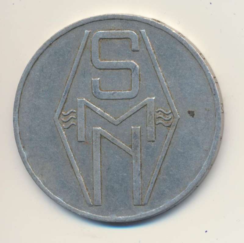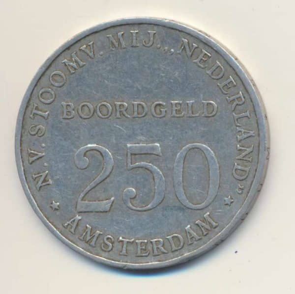 Uitgegeven vanaf 1947 door de N.V. Stoomvaart Maatschappij Nederland voor uitsluitend gebruik aan boord van haar passagiersschepen, met name de ‘Oranje’ de ‘Johan van Oldenbarnevelt’ en de ‘Zuiderkruis’. Op de munt staat het randschrift: Semper Mare Navigandum (altijd moet de zee bevaren worden).