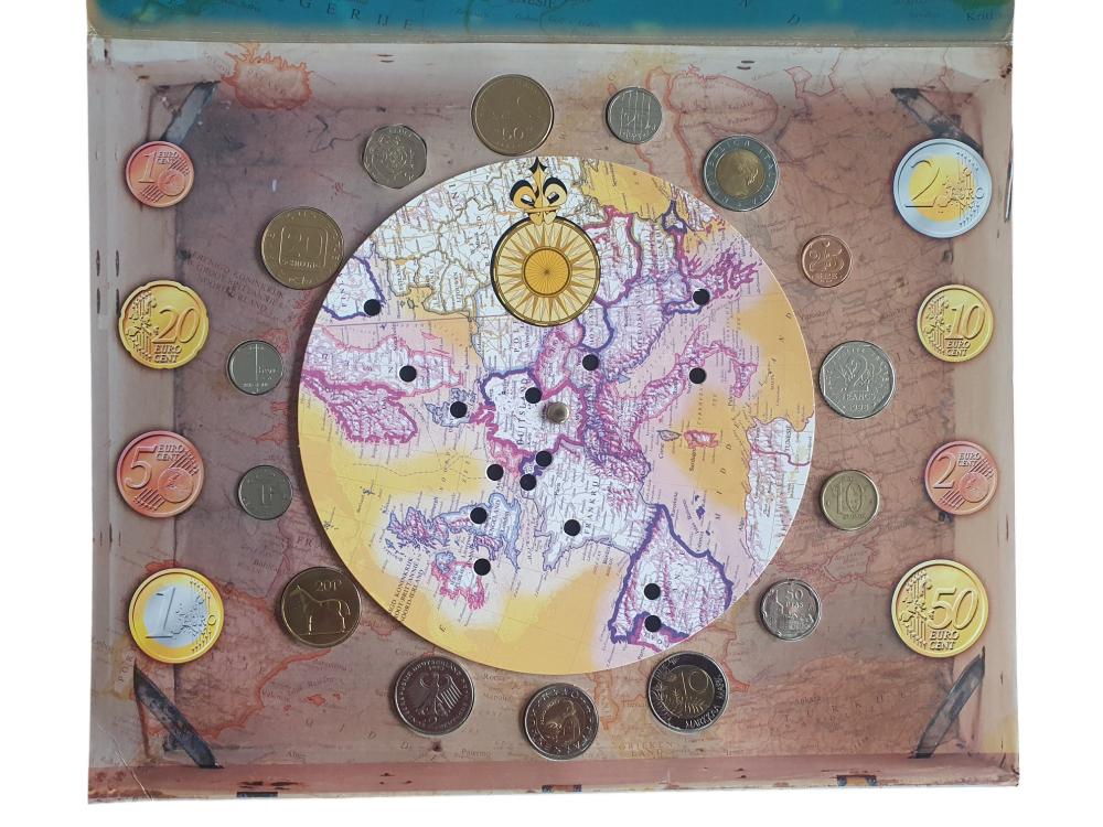Met draaibare kaart van Europa: door te draaien naar de nummers wijst deze kaart de betreffende munt aan.
