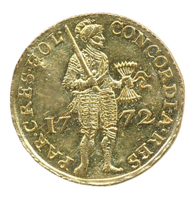 De gouden dukaat van de Провинция Голландия is onderdeel van de muntenreeks uitgegeven door de Republiek der zeven verenigde Nederlanden, en is een van de hogere muntwaardes bestemd voor circulatie. De munt heeft op de voorzijde een ridder met een bundel pijlen en een zwaard in de hand, wat de militaire kracht en standvastigheid van de republiek vertegenwoordigde. Het randschrift van de munt bevat de Latijnse tekst: ‘Concordia res parvae crescunt’, wat ‘Eendracht maakt kleine dingen groot betekent’. De dukaat heeft op de keerzijde een versierd patroon met de tekst: MO: ORD: PROVIN: FOEDER BELG · AD LEG · IMP, ofwel ‘Moneta ordinum provinciarum foederatorum belgicarum ad legem imperii; wat samengevat te maken heeft met de munten die uitgegeven zijn door de provincies in naam van de Republiek. De Dukaat is gemaakt van 986/1000 goud, en heeft gemiddeld een diameter van 21,8 millimeter en weegt 3,5 gram. Naast de gouden dukaat werden er ook nog de volgende munten gebruikt in de republiek: