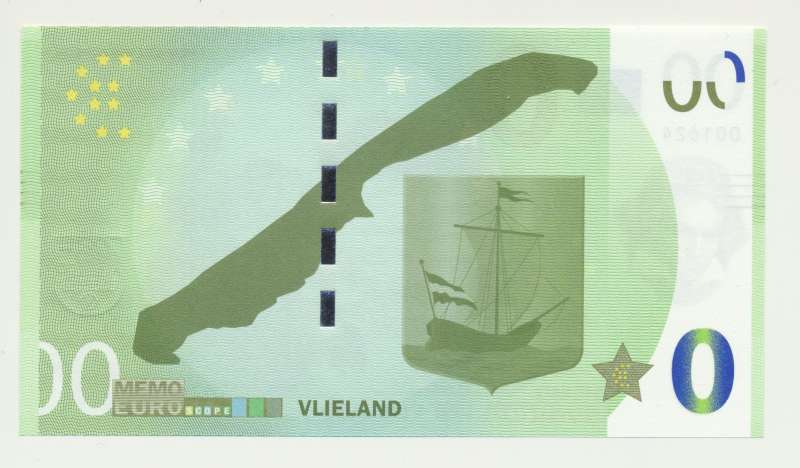 Нидерланды 0 евро банкнота ВлиландПередняя обложка; Достопримечательности Влиланда.Реверс: Влиланд с кораблем.