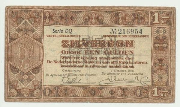 Eind jaren 30 werden door de grote spanningen in Europa en het uiteindelijk uitbreken van de tweede wereldoorlog grote aantallen zilveren munten opgepot door de Nederlandse bevolking. Hierdoor ontstond een groot tekort aan wisselgeld, en moesten er net zoals in de eerste wereldoorlog weer zilverbonnen worden uitgegeven door het ministerie van financiën. De zilverbonnen met de datum 1938 zijn grotendeels uitgegeven tijdens de bezetting, omdat alle munten van een en twee en een halve gulden ingeleverd moesten bij de bezetter. De zilverbon 1938 heeft de handtekeningen van Jacob Adrian de Wilde (minister van financiën) en Luijsterburg (Ambtenaar van het ministerie van financiën). Naast de zilverbon 1938 zijn er ook nog de volgende biljetten bij de serie: