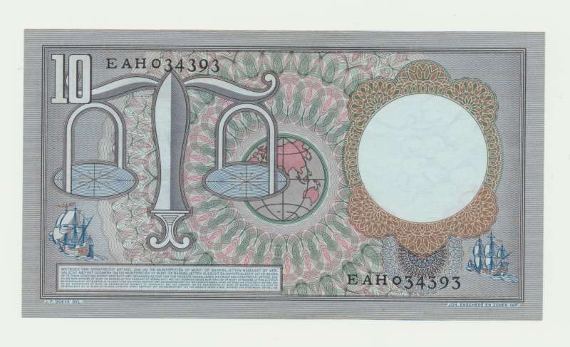 Банкнота номиналом десять гульденов с изображением Хуго де Гроота относится к первой серии наследства Эппо Доэва, которая поступила в обращение в начале 1950-х годов. На лицевой стороне изображен Хьюго де Гроот (известный голландский философ), а на реверсе - весы, глобус и два корабля, символизирующие заморскую торговлю Нидерландов. На водяном знаке можно увидеть скопление голубей. Существует два варианта этого типа банкнот, оба с подписями президента DNB Холтропа и секретаря DNB де Йонга: