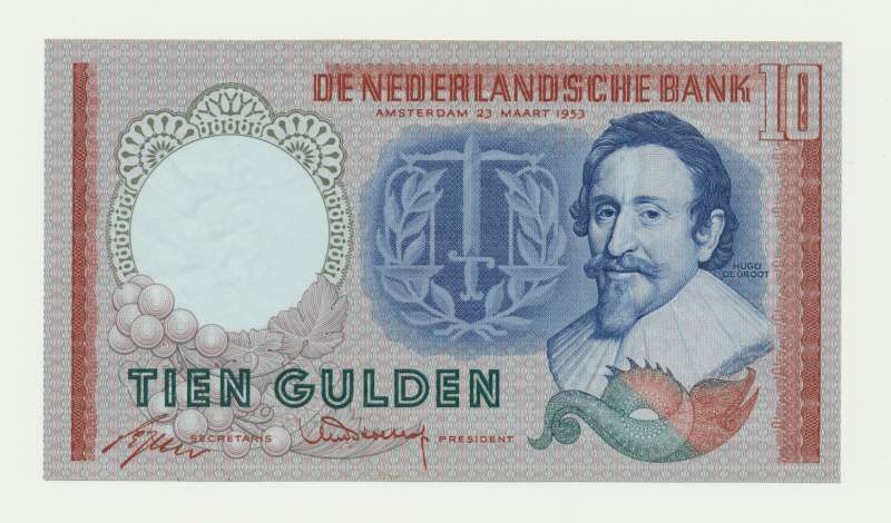 Купюра в десять гульденов с изображением Хьюго де Гроота была изъята из обращения в 1978 году.