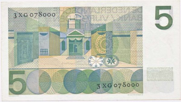 Пятигильдерная купюра 1966 года была разработана известным дизайнером Оксенааром, который был назначен голландским банком для разработки новой революционной серии банкнот. Банкнота достоинством в пять гульденов 1966 года была заменена монетой достоинством в пять гульденов в 1988 году и изъята из обращения в 1995 году.
