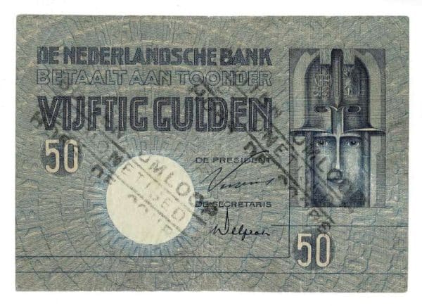 Het biljet van vijftig gulden Minerva werd bij de geldzuivering van 1945 uiteindelijk uit de omloop genomen.