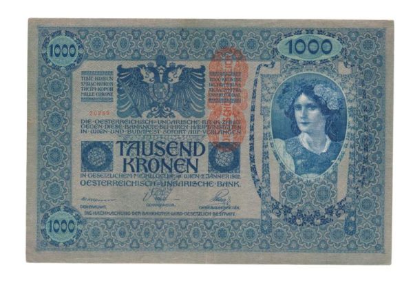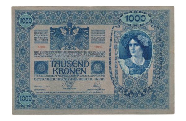 1000 Kronen was in begin 20e eeuw een groot bedrag, en de biljetten kwamen eigenlijk pas echt veelvuldig in omloop na de eerste wereldoorlog omdat er in het nu ‘Deutsch Österreich’ een hyperinflatie was ontstaan.