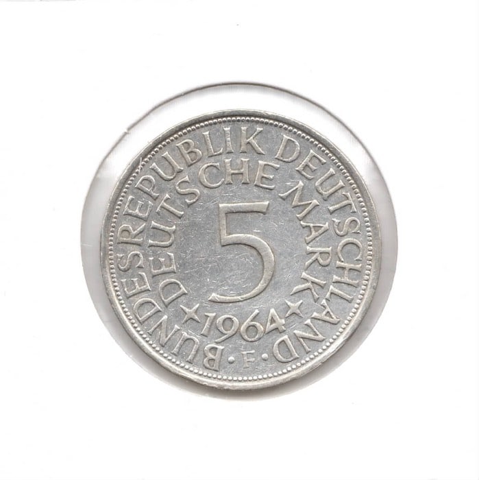 Duitsland 5 Mark 1964 F 克劳斯编号:KM 112 时期:西德(BRD)(1948 - 1989 年) 边缘说明:"EINIGKEIT UND RECHT UND FREIHEIT"(团结、正义与自由) 设计师:Albert Holl 重量:11.2 克 直径:29 毫米 厚度:2.07 毫米 详情请查看扫描件 如有问题,请随时给我们留言。
